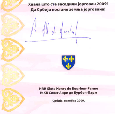 Ove godine je i Savez pčelarskih organizacija Srbije učestvovao u ovoj vrlo interesantnoj i korisnoj manifestaciji, tako što je određeni broj njegovih članova izlagao pčelinje proizvode. Poziv je bio objavljen samo preko našeg sajta jer nije bilo dovoljno vremena da se objavi i u časopisu, a njemu su se odazvali i u manifestaciji sa svojim proizvodima učestvovali sledeći članovi SPOS-a (9 se prijavilo, a 8 je učestvovalo): Marjan Gojković iz Čačka, Dušan Mandić iz Bačke Palanke, Dragan Aćimović iz Lazarevca, Vojislav Kapor iz Bajmoka, Vladimir Hunjadi iz Petrovaradina, Dragan Đorđević iz Kamenova, Miodrag Radosavljević iz Valjeva i Nikola Limanović iz Beograda. Inače, na samoj manifestaciji je bilo prisutno oko 700 zvanica iz različitih oblasti društvenog i javnog života, a skup je otvorio Njegovo Kraljevsko Visočanstvo Sikst Anri de Burbon-Parm, naslednik loze francuskih kraljeva. Nakon sađenja jorgovana, Njegovo Kraljevsko Visočanstvo je svakom ko je posadio jorgovan, potpisao zahvalnicu.