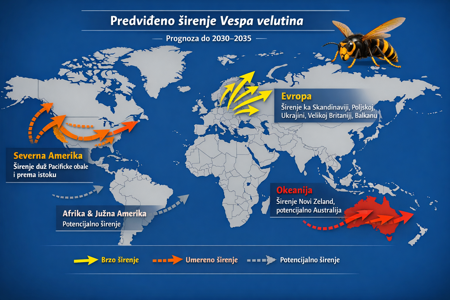 Откриће жутоногог стршљена на Новом Зеланду поново је скренуло пажњу на глобално ширење ове инвазивне врсте. Како је Vespa velutina напустила свој природни ареал и којим се путевима данас шири светом? У тексту је представљена хроника појаве и процена будућих сценарија.