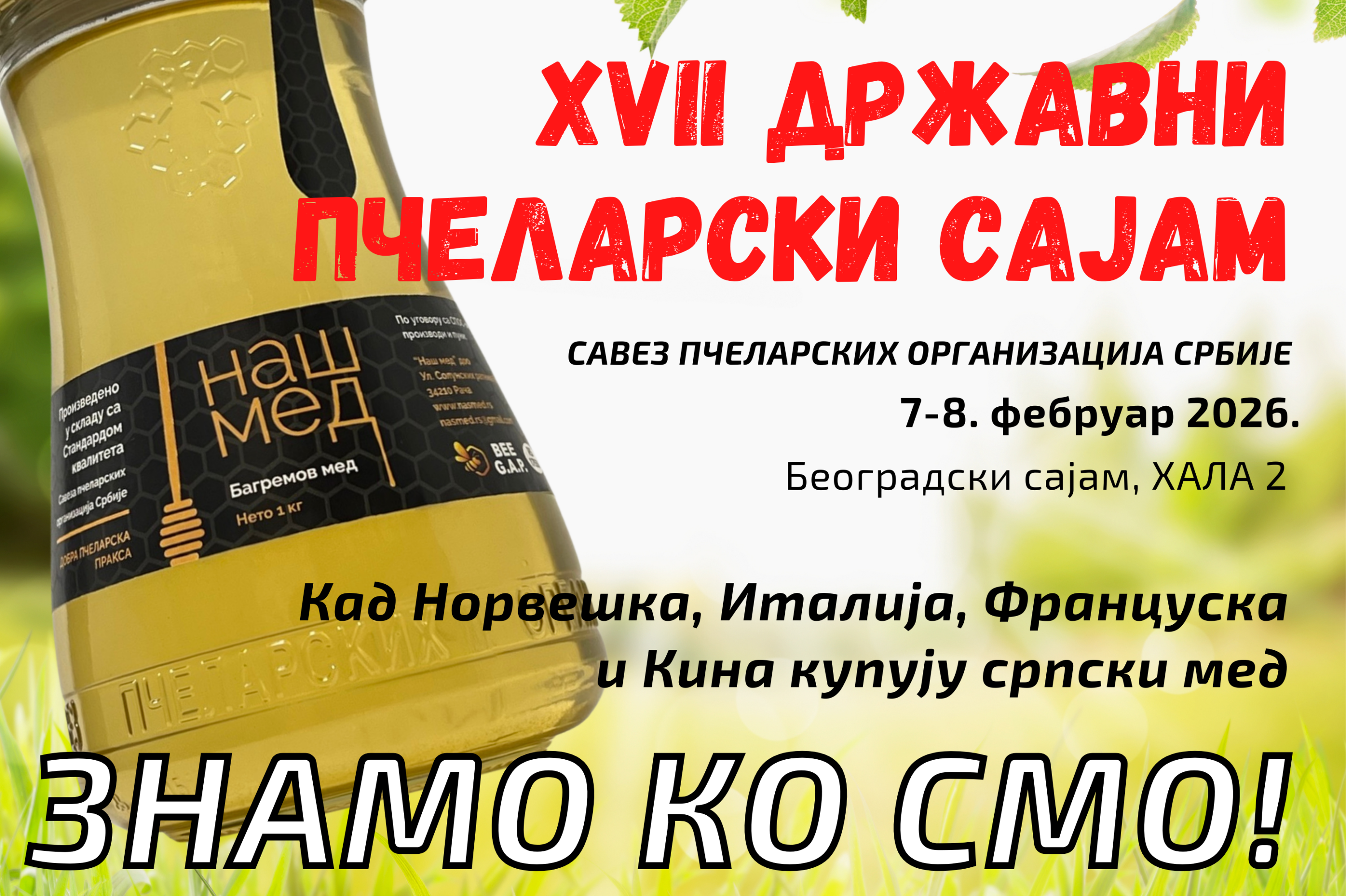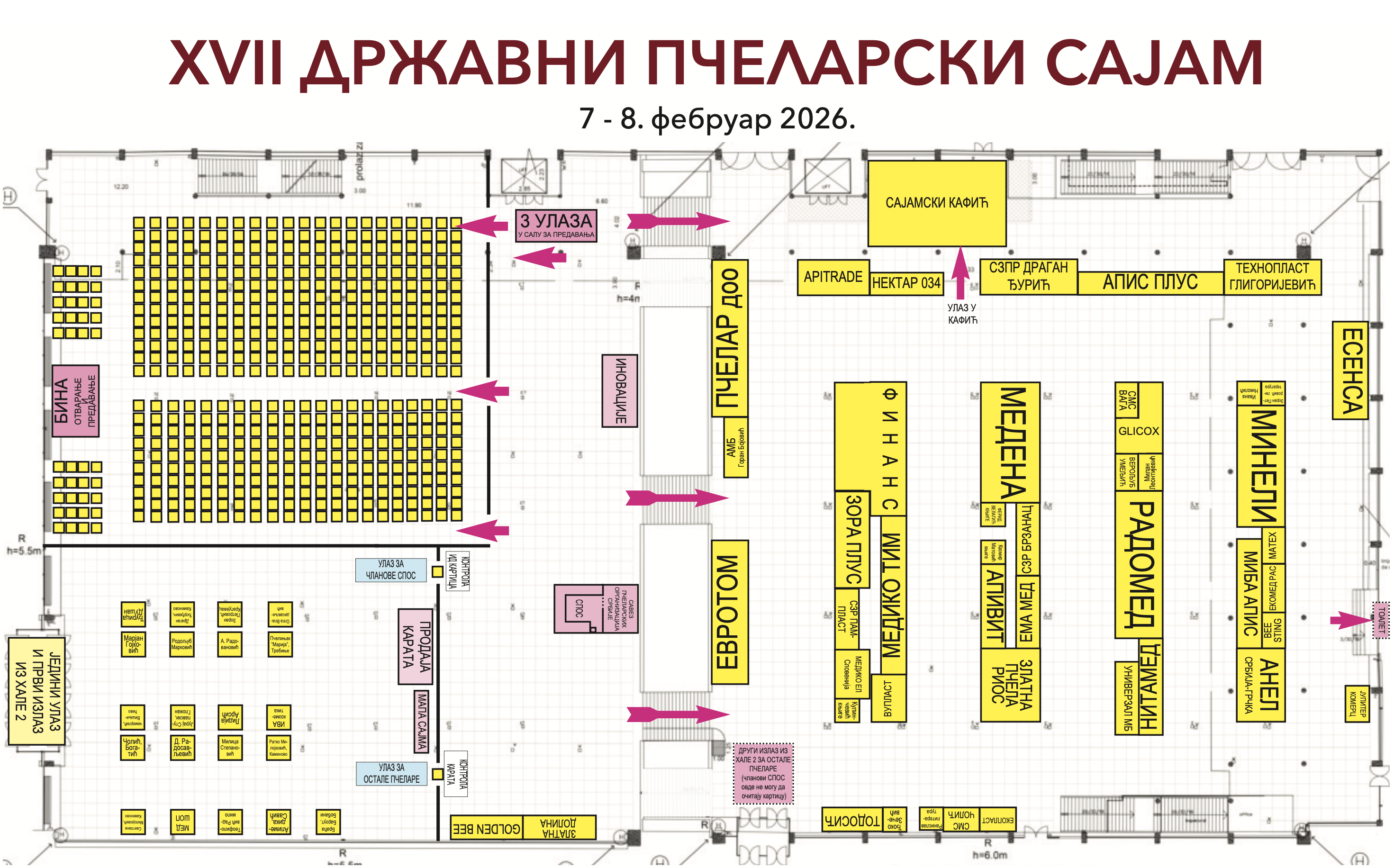 Objavljujemo raspored štandova na predstojećem XVII Državnom pčelarskom sajmu koji se u organizaciji Saveza pčelarskih organizacija Srbije održava u Hali 2 Beogradskog sajma 7. i 8. februara 2026. godine.