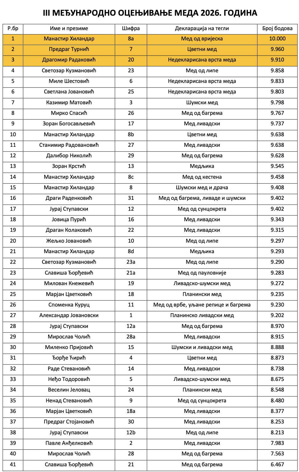 Као што је познато, Савез пчеларских организација Србије је у сарадњи са Српским друштвом за тестирање и оцењивање меда организовао Треће међународно оцењивање меда. Комплетне резултате објављујемо данас, а на XVII Државном пчеларском сајму уручићемо награде за прва три најбоље оцењена меда, у суботу 7. фебруара 2026. године у 10 сати на отварању сајма, као и Повељу изузетности за све учеснике такмичења, те позивамо све учеснике такмичења да дођу на уручење признања и заједничко фотографисање.