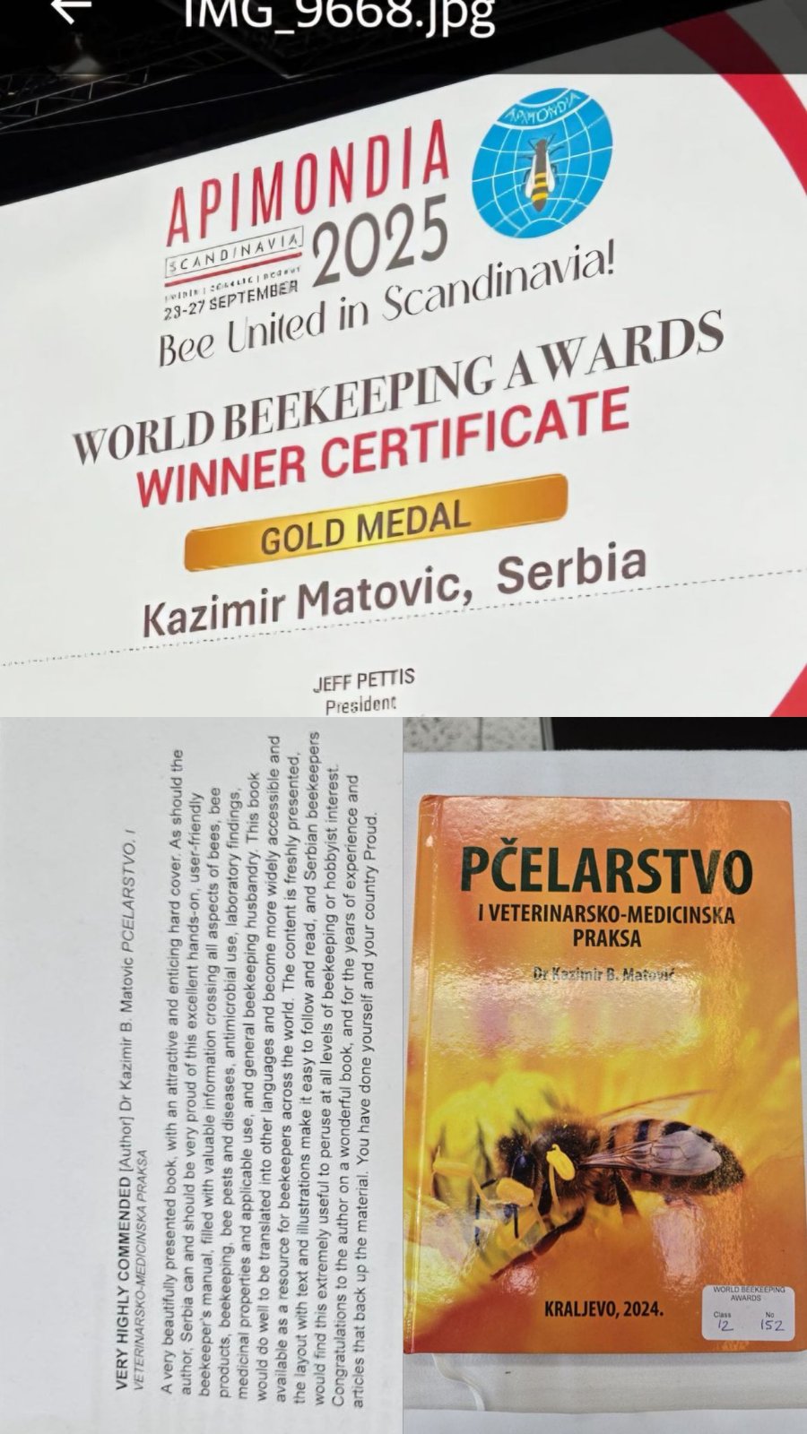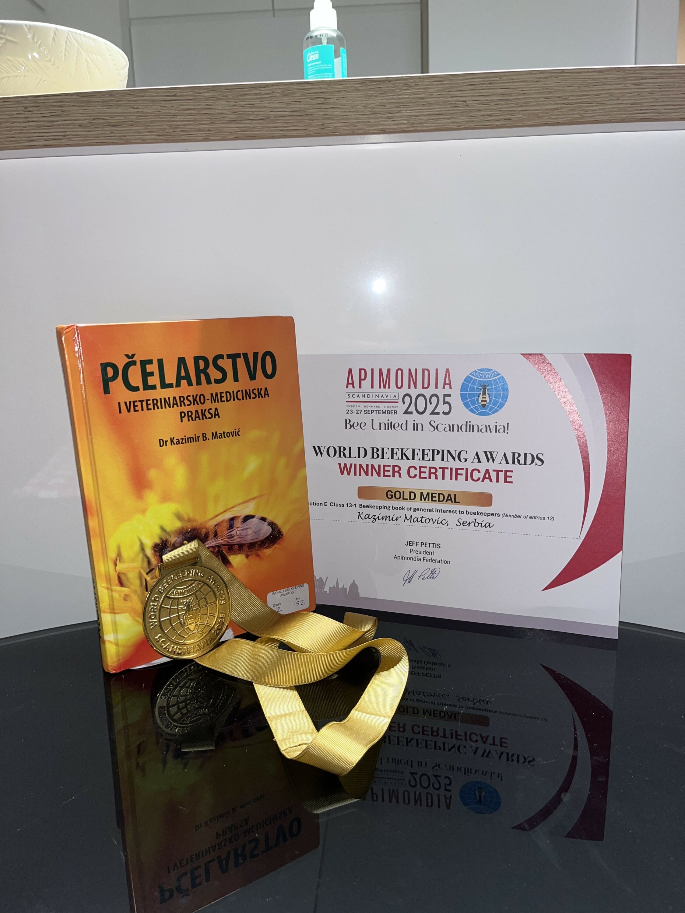 На 49. конгресу Светске пчеларске федерације АПИМОНДИЈА одржаном у Kопенхагену, Данска од 23 – 27. 9. 2025. године ,,APIMONDIA SCANDINAVIA 2025 49th APIMONDIA Congress„, у секцији Е штампани материјали, класи 13, књига о пчеларству из Србије освојила је све позитивне критике, а њен аутор др Казимир Матовић златну медаљу.